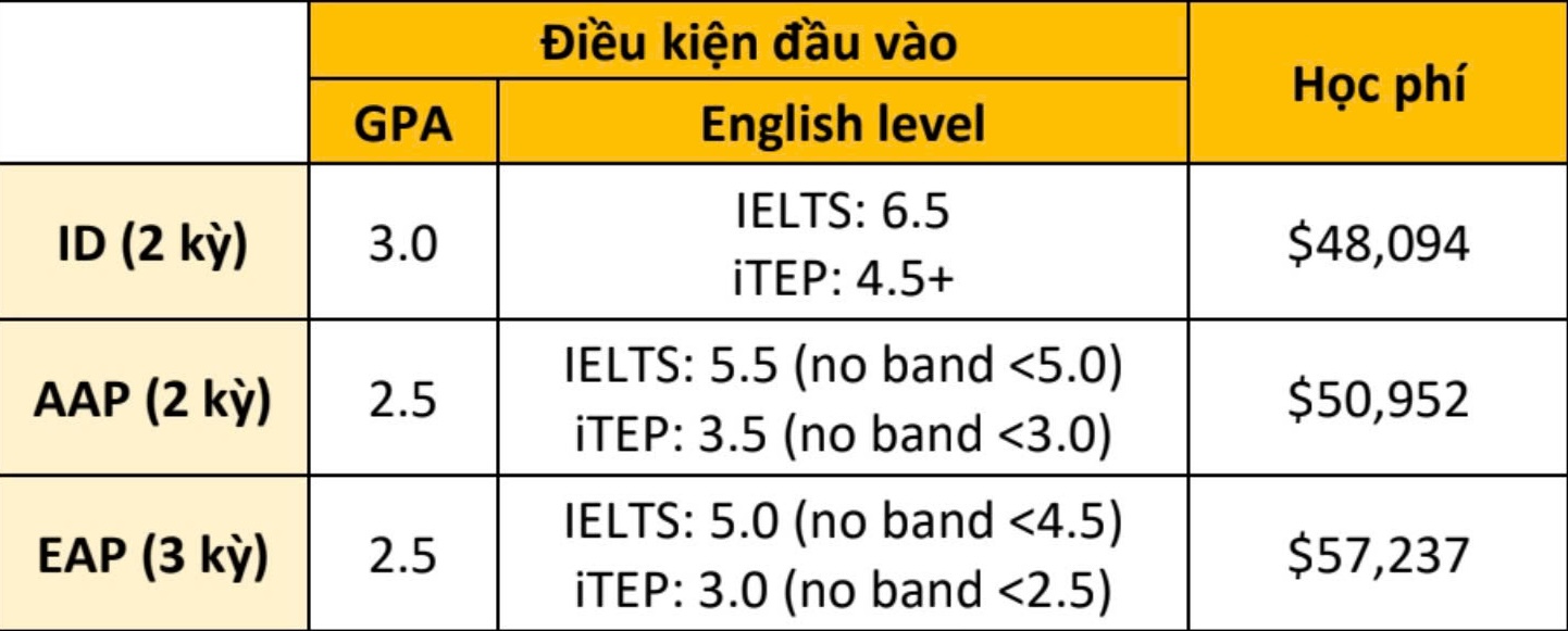• AAP: Academic Accelerator Program – Chương trình năm 1 cho sinh viên quốc tế 2 kỳ
